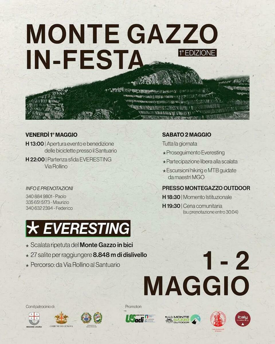 Debutta la prima edizione di “Monte Gazzo In-Festa”, la due giorni di sport e comunità in programma il 1° e 2 maggio sul Monte Gazzo, presentata in Sala Trasparenza di Regione Liguria. Un’iniziativa che, per la prima volta a Genova, porta anche una prova di “Everesting”, disciplina che prevede la ripetizione di una salita fino a raggiungere il dislivello complessivo dell’Everest, pari a 8.848 metri.
