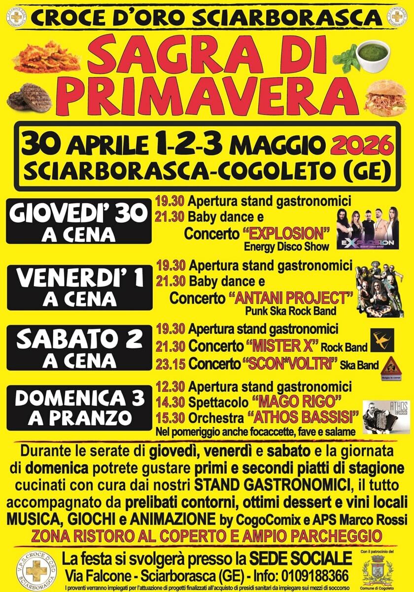 Da giovedì 30 aprile a domenica 3 maggio 2026 a Sciarborasca, frazione di Cogoleto, torna la Sagra di Primavera organizzata dalla Croce d’Oro: serate a cena fino a sabato e pranzo conclusivo domenica. Un’eco-festa solidale il cui ricavato sostiene le attività dell’associazione.