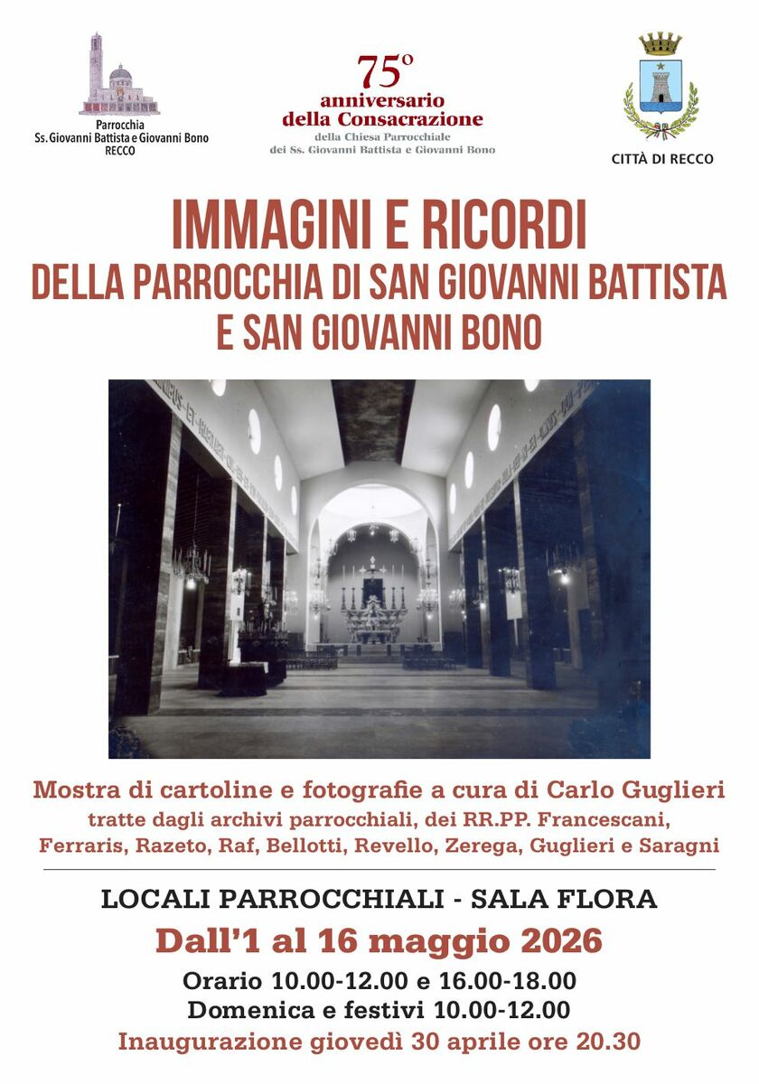 Settantacinque anni dopo la ricostruzione, sulle rovine della chiesa distrutta nel corso dell'ultimo conflitto mondiale, la città di Recco celebra il 75° anniversario della consacrazione della moderna parrocchia dei Ss. Giovanni Battista e Giovanni Bono. Il programma si apre giovedì 30 aprile, alle ore 17, con l’Adorazione Eucaristica, seguita dalla Santa Messa alle ore 18. Alle 20.30 è prevista l’inaugurazione della mostra fotografica “Immagini e ricordi della Parrocchia dei Ss. Giovanni Battista e Giovanni Bono”, curata da Carlo Guglieri, che raccoglie cartoline e fotografie tratte dagli archivi parrocchiali e di famiglie recchesi. La mostra resterà aperta nei locali parrocchiali - Sala Flora dal 1° al 16 maggio, con orario 10–12 e 16 –18; domenica dalle ore 10 alle 12.