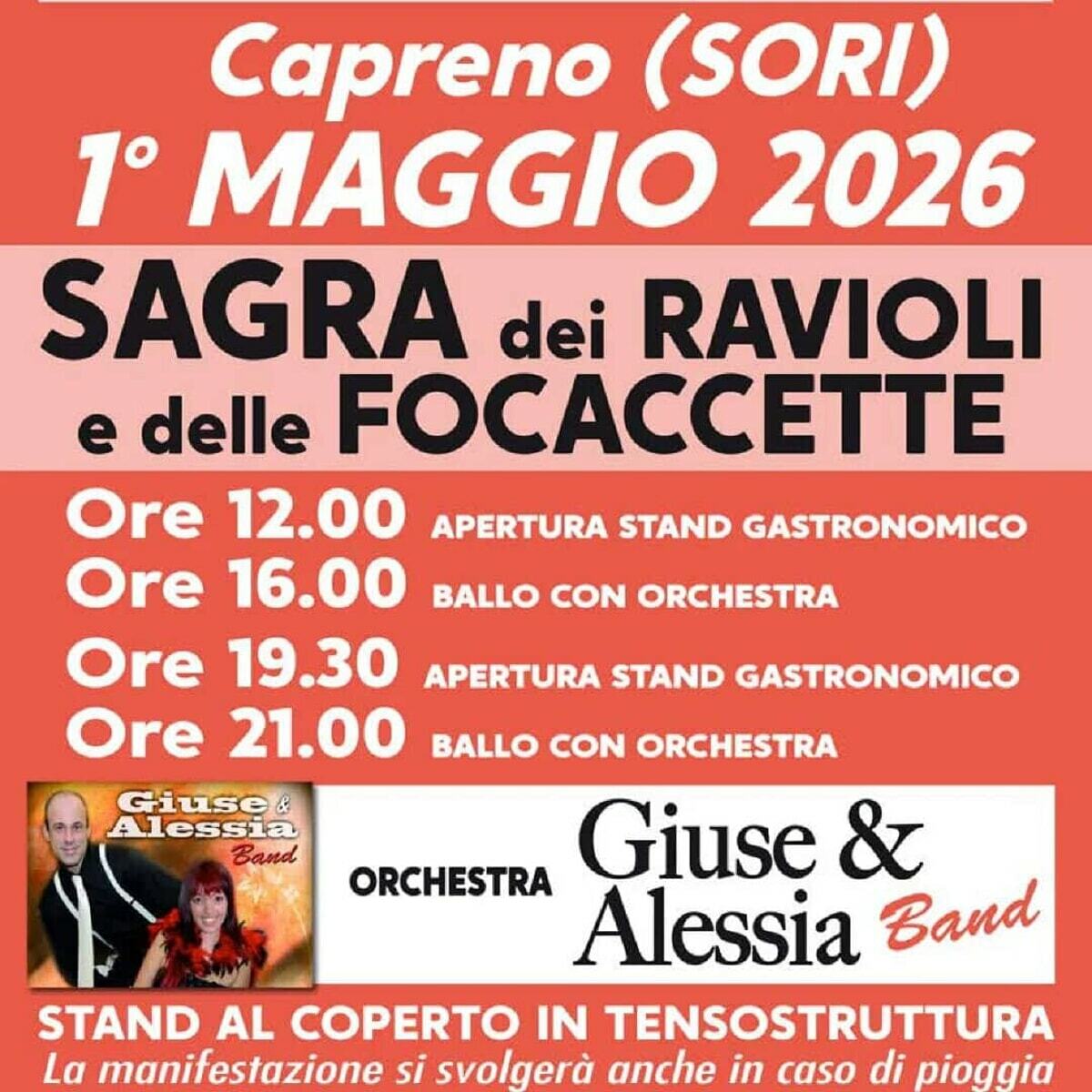 A Capreno, frazione di Sori, la Società Ricreativa Sportiva Culturale organizza l’edizione 2026 della Sagra dei Ravioli e delle Focaccette: stand gastronomici aperti dalle 12, musica dal vivo nel pomeriggio e serata con orchestra dalle 21, dopo la riapertura degli stand alle 19.30. Evento al coperto, confermato anche in caso di pioggia.